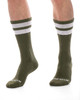 The Barcode Berlin Gym Socks in Olive with White Stripes deliver a more grounded take on classic athletic styling. The deep olive base evokes utilitarian sport and subtle uniform references, while the crisp white double stripes at the cuff keep the look clean and sharply defined. It’s understated at first glance - yet unmistakably intentional.
