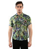 The all-over print features bold cobalt, forest green, and brown leaf motifs on a vibrant aloe base—offering crisp contrast and a quietly confident presence. A go-to statement for summer days and warm nights alike.