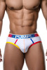 The Spectrum Brief features a breathable white nylon mesh body, colourful cotton piping, and vivid orange stitching for just the right amount of playful flair. Finished with red and yellow rear leg elastics for firm support, it’s a bold choice built for visibility, movement, and comfort. Whether you're marching or lounging, this brief keeps you feeling proud from the inside out.